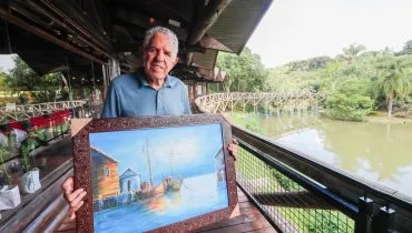 Apontando para alguns quadros, ele explica o que mais enxerga neles além daquilo que já está pintado. “Por exemplo, eu podia por uma pessoa em pé na beirada da casa, um cachorrinho descendo, um homem na canoa pescando. Mas se eu for aumentar muito isso aí, fica mais difícil vender também. Se alguém pedir eu faço”, completa.