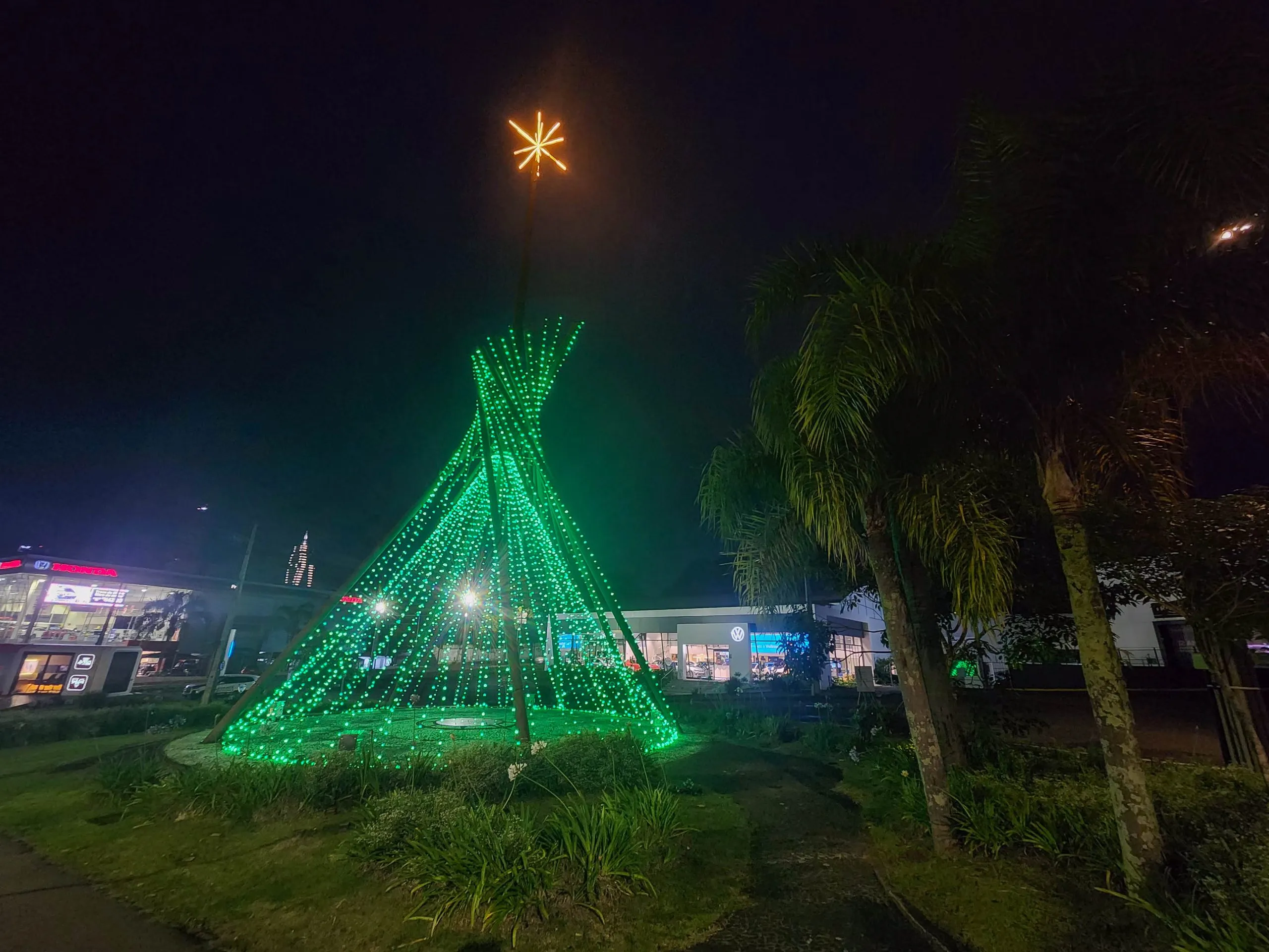 O local se tornou um ponto popular para fotos em família durante as festividades de fim de ano, atraindo moradores e turistas interessados em registrar momentos com a decoração iluminada ao fundo.