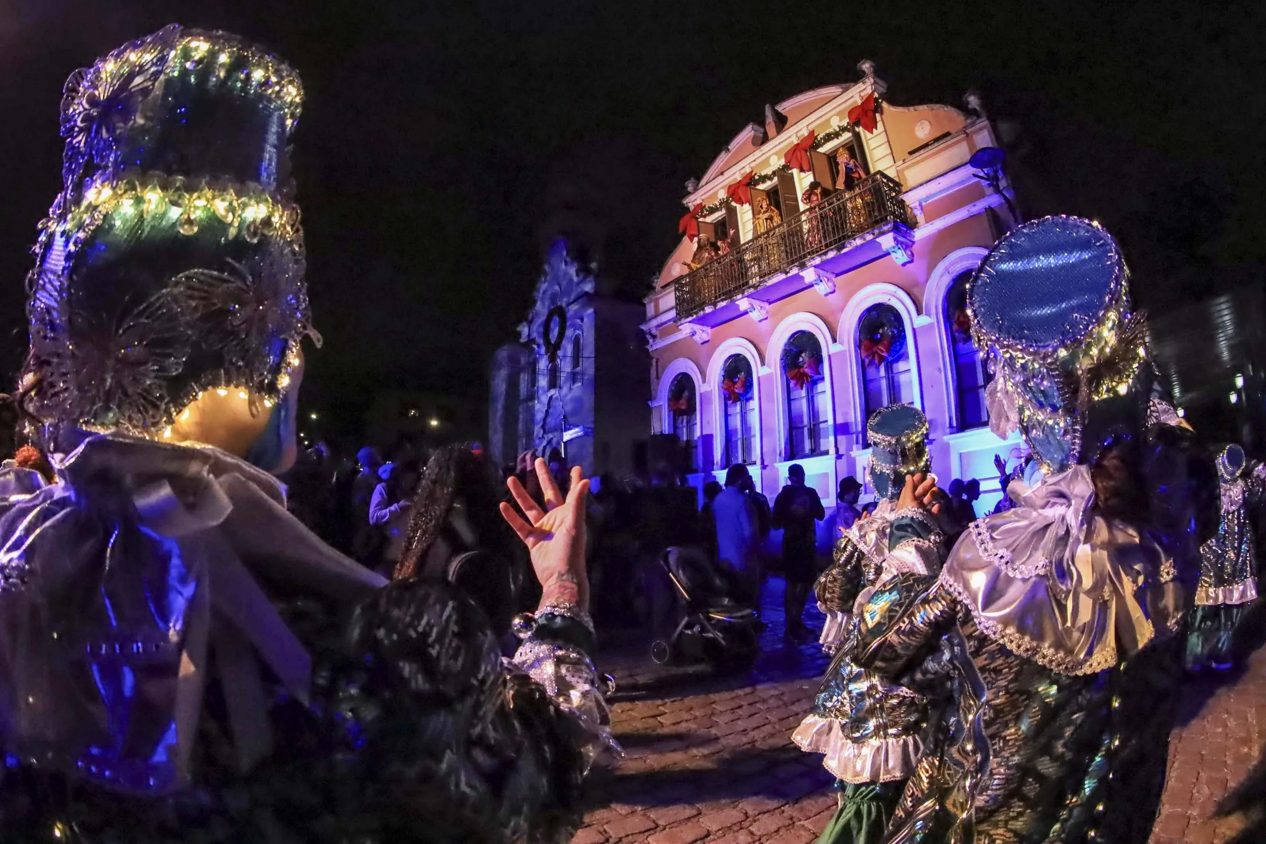 Um dos destaques foram os bonecos gigantes de Papai e Mamãe Noel, com quatro metros de altura, criados pelo artista Eduardo Santos. Cinco artistas são necessários para manipular cada boneco, criando uma movimentação fluida e performática que encantou crianças e adultos.
