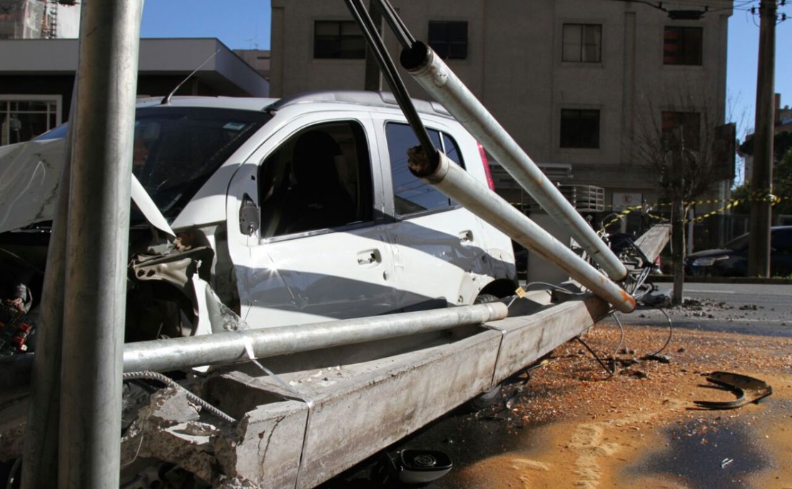A motorista do Uno, uma mulher de 30 anos, bateu na roda esquerda traseira do Gol. Ela se perdeu, bateu numa placa de sinalização e depois derrubou o poste. Por muito pouco, a estrutura não caiu em cima do carro.