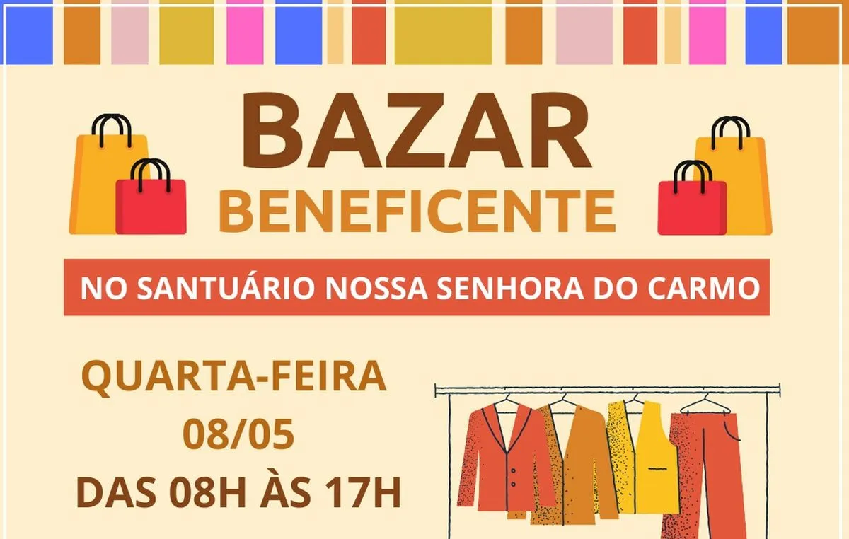 O Santuário Nossa Senhora do Carmo promove nesta quarta-feira (8) mais uma edição do tradicional Bazar Beneficente. O atendimento será das 8h às 17h. O bazar irá contar roupas novas e seminovas, de meia estação, inverno e verão, com peças femininas, masculinas e infantis.