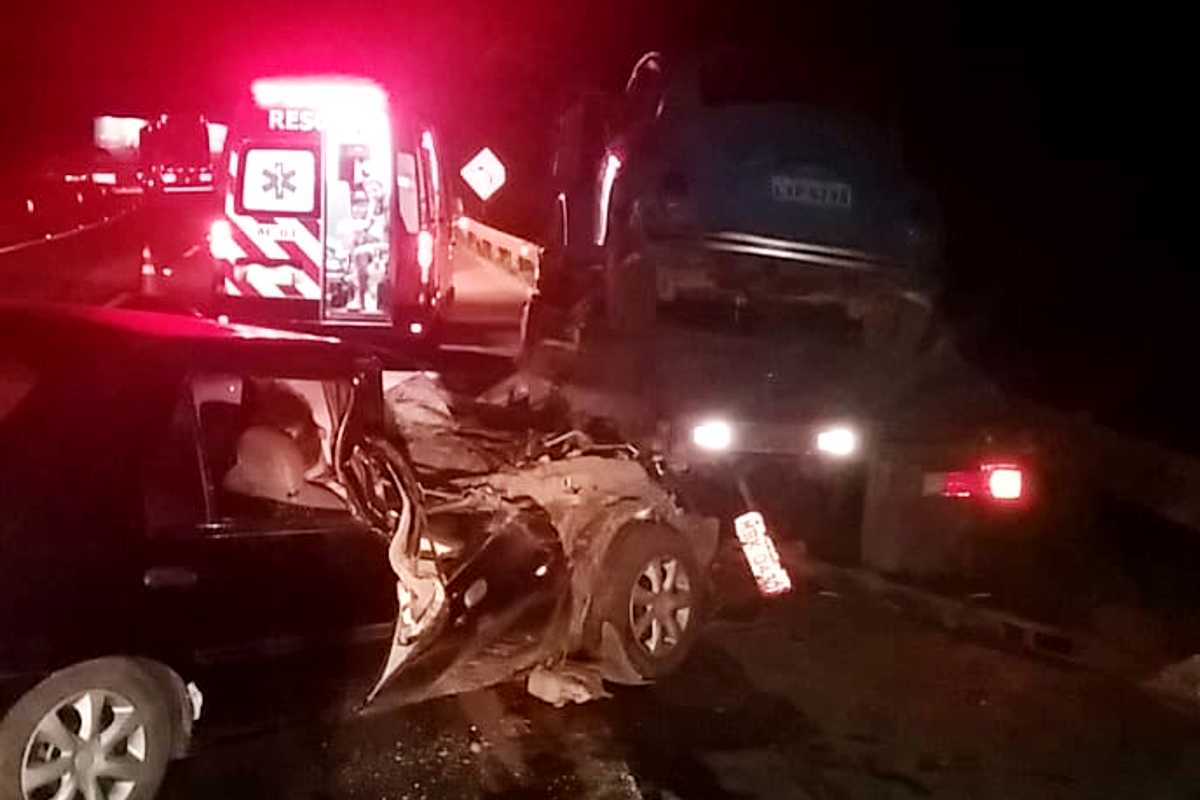 O acidente ocorreu na madrugada desta quarta-feira (1º) quando o motorista do veículo Fiesta atingiu a traseira do caminhão guincho, que estava no acostamento com o pneu furado tentando contatar a concessionária que atende o trecho.