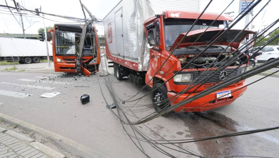 Um dos cruzamentos mais caóticos de Curitiba, na Rua Eduardo Sprada com a Av. Juscelino Kubitschek de Oliveira, na CIC, ficou completamente travado após um acidente entre um biarticulado e um caminhão, no começo da tarde desta quinta-feira (09).