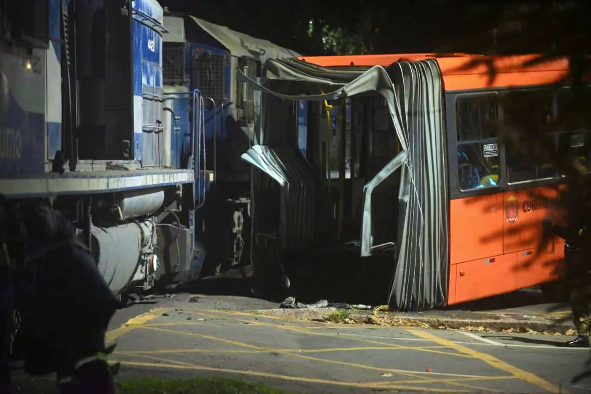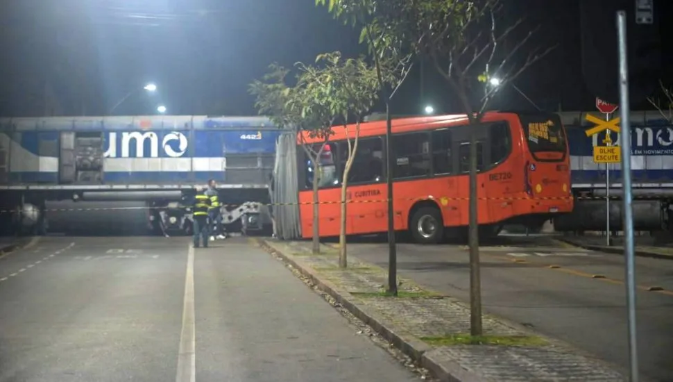 Biarticulado parte ao meio após acidente com trem em Curitiba; Onze ficaram feridos