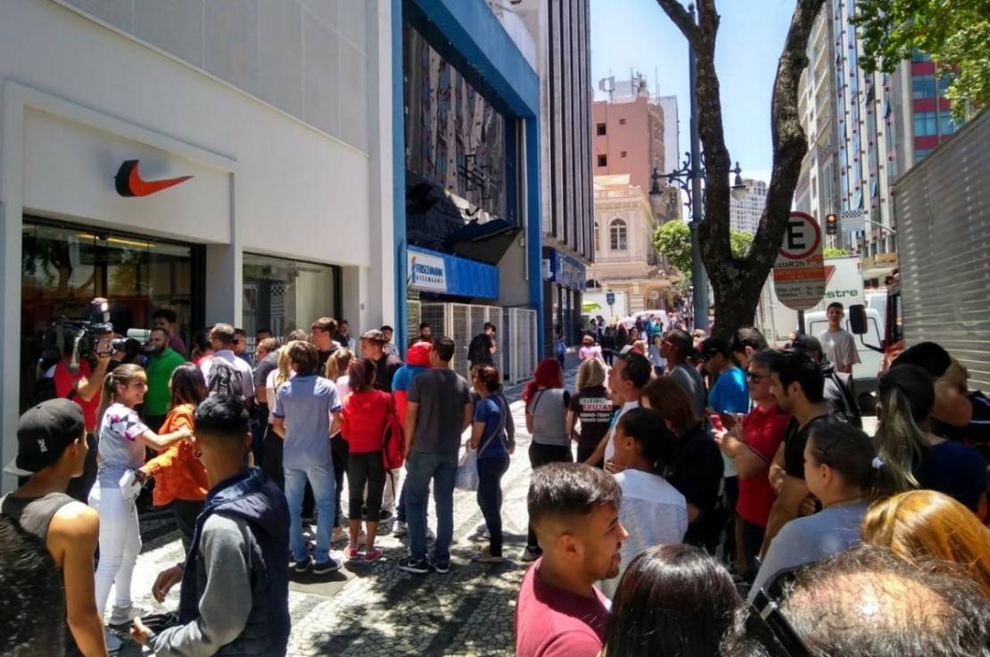 Esse é o tempo de espera de boa parte de quem foi comprar tênis ou roupas na loja da Nike na Rua Barão do Rio Branco no fim da manhã desta sexta. Para encarar a fila debaixo do sol, muitos clientes apelaram para sombrinhas.