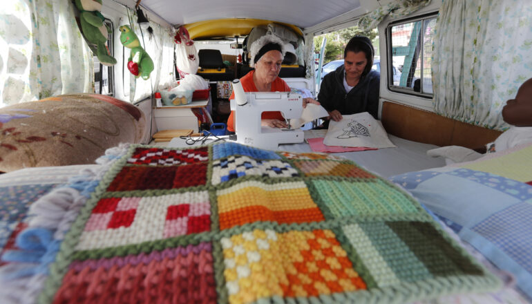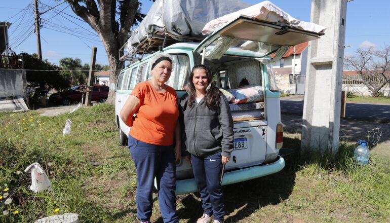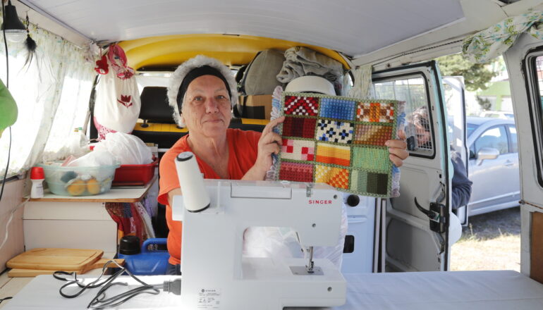 As bordadeiras Hulda Vidal, 71 anos, e Ane Xavier, 42 anos, moram dentro de uma Kombi, em Curitiba. A vida nômade começou há um ano e meio, em 15 de novembro de 2021, mas o veículo foi comprado por elas há quatro anos e a pandemia acelerou os planos de mudança. Com a venda de bordados e o oferecimento de cursos presenciais sobre essa arte, o sonho é rodar pelo Brasil sem amarras para levar o conhecimento a mais gente.