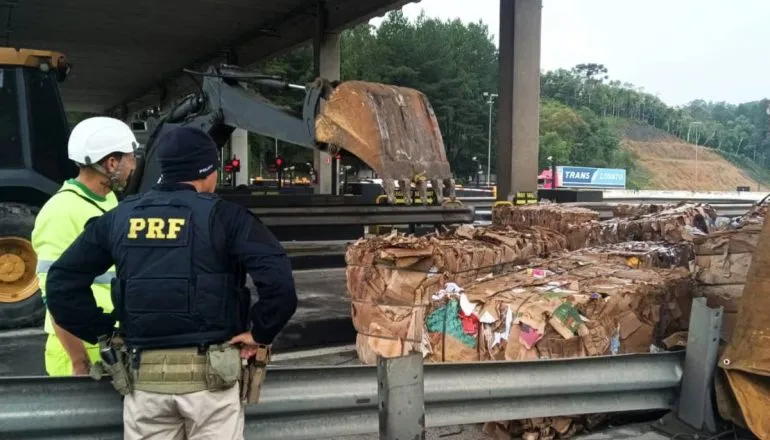 A carga, composta por materiais recicláveis organizados em grandes blocos, como plásticos e papelão, ficaram espalhados nas proximidades da cabine.