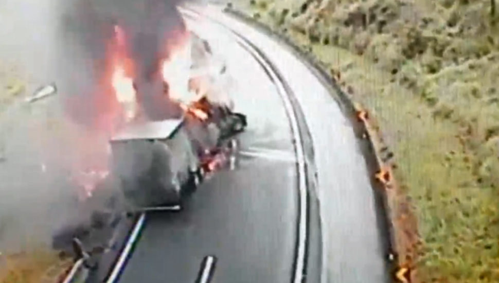 Imagens reveladas pela PRF mostram o momento em que veículos param bruscamente para tentar evitar uma colisão com o veículo em chamas em um trecho de declive.