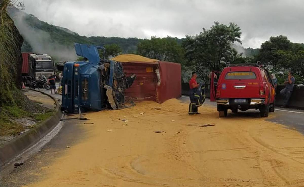 Segundo a Polícia Rodoviária Federal (PRF), equipes de atendimento se deslocam para a área da ocorrência, que foi registrada por volta das 13h30. Trata-se de uma colisão envolvendo dois veículos de carga, uma carreta porta container e uma carreta graneleira.