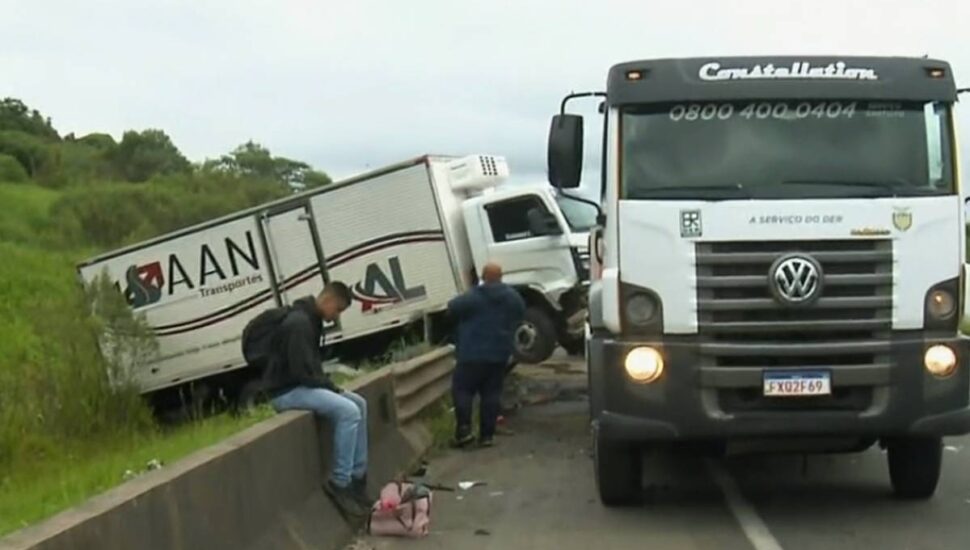 Um acidente envolvendo um caminhão baú deixa o trânsito da BR-376, no sentido Interior – Curitiba com uma faixa bloqueada, na manhã desta quarta-feira (27). O caminhoneiro foi fechado por um colega de profissão e precisou jogar o veículo para o acostamento. Por sorte ninguém ficou ferido, mas o trânsito no quilômetro 116, logo no cruzamento com a BR-277, está com meia pista. O acidente ocorreu nas proximidades de Campo Largo, na região metropolitana de Curitiba.