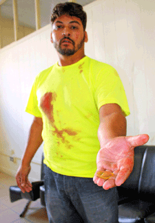Nervosos, os dois motoristas perderam a cabeça, começaram a discutir e a se digladiar no meio da rua. O motorista do Tempra alega que foi agredido primeiro e, para se defender, pegou a barra de ferro de dentro do carro. “Ele saiu no braço e eu revidei. Corri para o carro e peguei a barra que eu ia usar para fixar uma placa luminosa. Foi um impulso”, lamentou o instalador, que ficou com a camiseta manchada com o sangue do desafeto e teve os óculos quebrados.