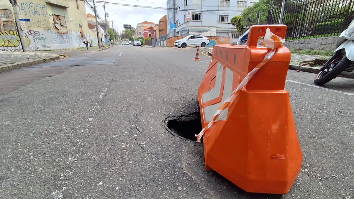 Um buraco na Rua João Manoel, esquina com a Rua Paula Gomes, no bairro São Francisco, em Curitiba, está levando perigo aos motoristas. O local está sinalizado apenas com uma barreira horizontal desde a abertura do asfalto, há mais de uma semana, mas não é o suficiente.