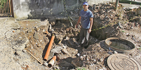 Buraco de quase quatro metros de largura e cerca de um metro e meio de profundidade já se tornou parte do cenário da Rua Eloy de Assis Fabris, no Novo Mundo. Aberta no final de junho, devido à quebra na manilha da via, a cratera tem atrapalhado a vida da vizinhança e, principalmente, a do mestre de obras Paulo José de Miranda. A cratera está em frente à casa dele. “O buraco está aqui há tanto tempo que estou começando a achar que faz parte da obra do metrô de Curitiba”, brinca. Segundo Paulo, o buraco foi aberto no dia 28 de junho, quando um dos encanamentos da rua estourou. Por causa do disso, a área em frente à casa do mestre de obras cedeu. “A terra começou a cair e a afundar e o buraco foi ganhando tamanho. Quando vi que ficou enorme fui chamar a Sanepar e a prefeitura para ver o que tinha acontecido. Foi quando começou o problema”, conta.