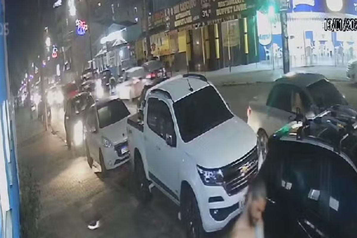 A imagem mostra que o motorista passa em alta velocidade e atinge o cadeirante, que está se deslocando na lateral da avenida. Com o impacto da batida, o homem foi jogado para a calçada.