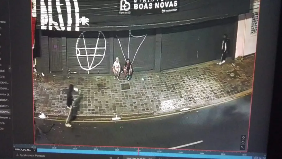 Na madrugada de sábado (6/12), câmeras de segurança da Muralha Digital registraram dois indivíduos pichando um estabelecimento comercial na Praça do Redentor, bairro São Francisco, em Curitiba. A Guarda Municipal foi acionada e localizou os suspeitos nas proximidades do local.