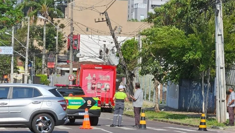 O caminhão carregado de Coca-Cola atingiu o poste localizado entre as Ruas Sete de Abril e Almirante Tamandaré. Três viaturas da Setran atenderam a ocorrência no local.
