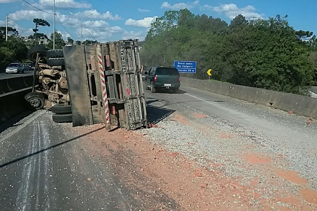 O tombamento de um caminhão carregado com tijolos bloqueou a BR-116, na altura do quilômetro 8, sentido São Paulo, na tarde desta terça-feira (18). De acordo com a Polícia Rodoviária Federal (PRF) o condutor teve ferimentos leves e foi socorrido por uma equipe médica da concessionária que administra o trecho.