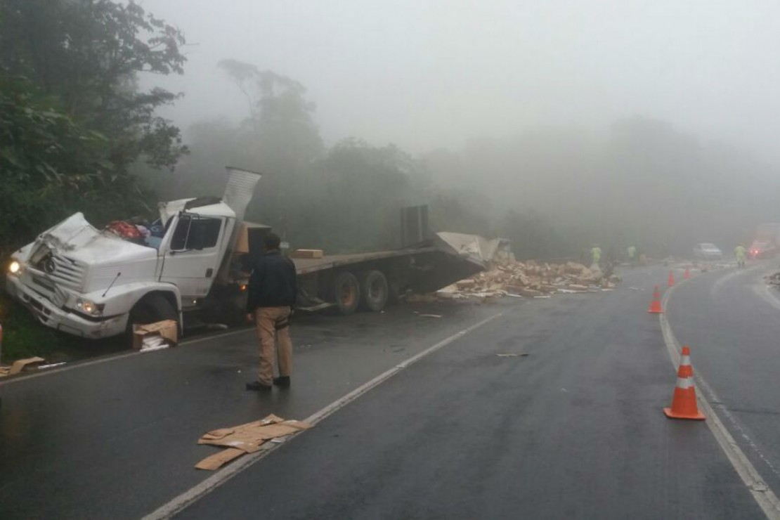 A carga foi totalmente recolhida na noite de quinta-feira (10), mas o caminhão tombado segue no local a espera do guincho. O acidente foi no quilômetro 666, na pista sentido Joinville, e não houve vítimas.