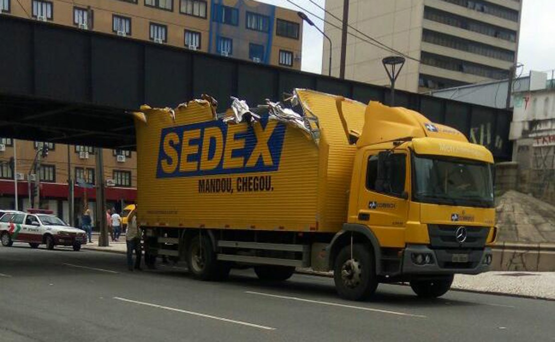 Um caminhão do Sedex, dos Correios, enroscou debaixo da Ponte Preta, na Rua João Negrão, no Centro de Curitiba, no início da tarde desta sexta-feira (19). Ninguém se feriu. Já o caminhão teve o teto inteiro destruído e foi preciso retirar a tampa traseira do baú para “desencalacrar” o veículo do local. A cobertura, que é de alumínio, foi “enrolando” igual à tampa de uma lata de sardinha, para que o veículo conseguisse sair.