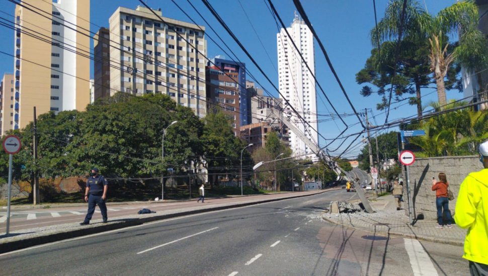 Alô você, que está passando pela Rua Ubaldino do Amaral, em qualquer um de seus sentidos, próximo ao cruzamento com a Avenida Sete de Setembro, em Curitiba. Um caminhão alto demais passou por ali e arrancou meia dúzia de fios de energia elétrica e telefone, além de quebrar um poste ao meio.