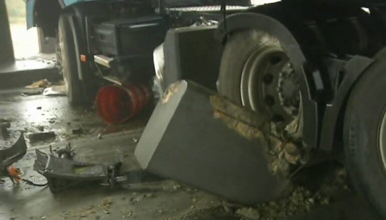 Caminhão ficou “preso” na estrutura desativada na BR-277 após se encaixar entre as cabines. Foto: Reprodução/RPC.