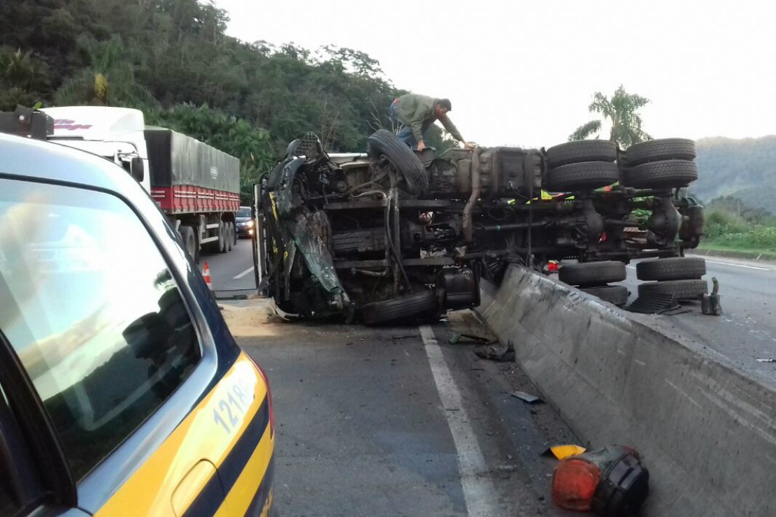Um acidente na BR-277, no trecho que liga Curitiba ao litoral do estado, deixa o trânsito em meia-pista em ambos os sentidos. Um caminhão tombou no canteiro central da rodovia na altura do quilômetro 34, próximo à entrada de Morretes, interditando a faixa da esquerda tanto para quem segue em direção às praias paranaenses quanto para quem retorna à capital. De acordo com a Ecovia, concessionária responsável pela estrada, ainda não há previsão para que o tráfego seja normalizado.