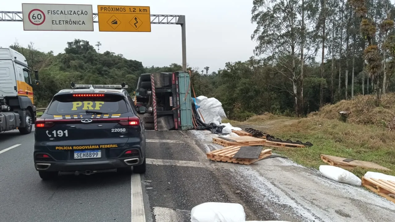 A Polícia Rodoviária Federal (PRF) foi acionada para atender um tombamento de um caminhão com derramamento de carga no km 24 da BR-116, sentido São Paulo, em Campina Grande do Sul – região metropolitana de Curitiba. O veículo estava carregado com mais de 50 toneladas de polietileno.