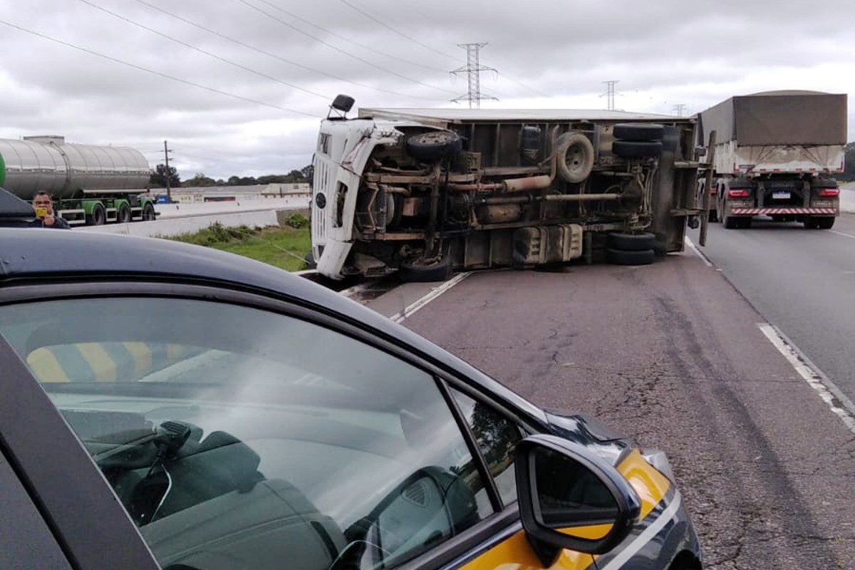 Um caminhão tombou na manhã desta terça-feira (30) em Curitiba, no km 590 do Contorno Sul, BR-376, no sentido Ponta Grossa. A região do acidente fica na Av. Juscelino Kubitschek De Oliveira, na Cidade Industrial de Curitiba.