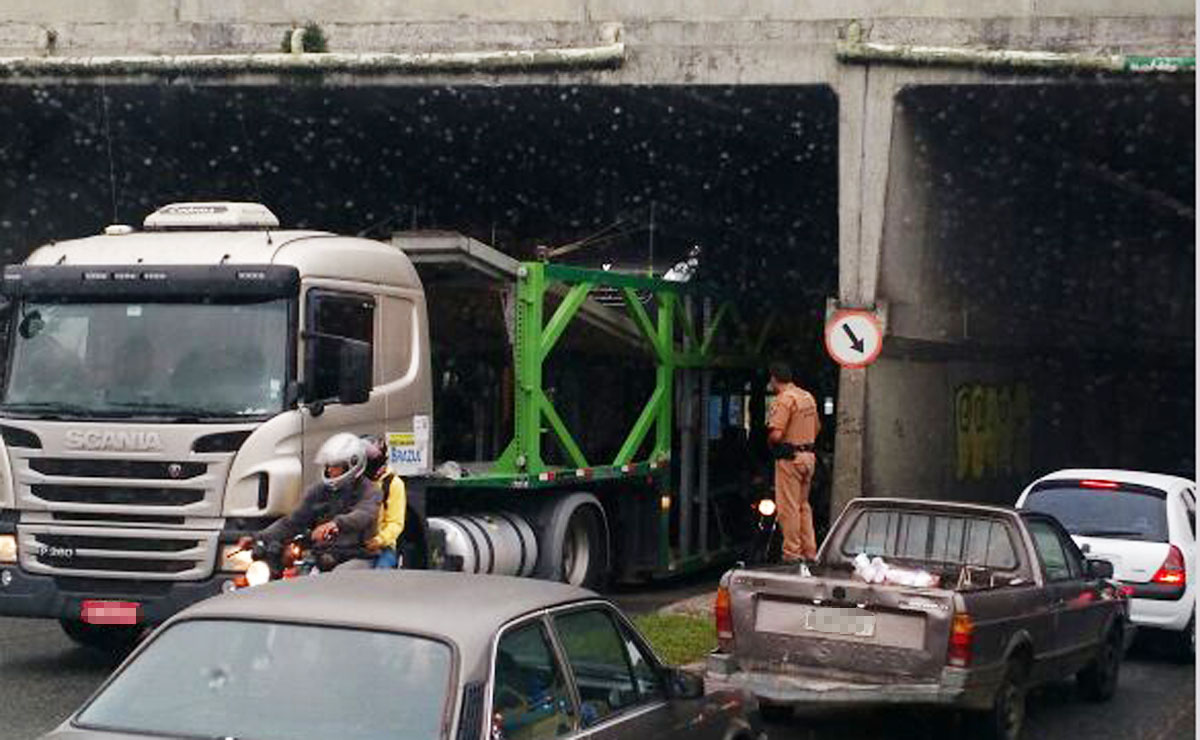 O motorista de um caminhão cegonha calculou mal a altura do veículo que ele transportava e acabou se envolvendo num acidente na manhã desta quarta-feira (8). Ninguém se feriu, mas as duas vans que eram levadas em cima do veículo acabaram danificadas.