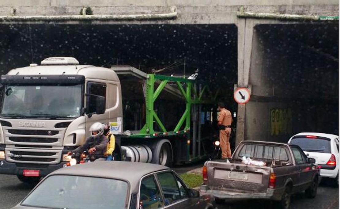O motorista de um caminhão cegonha calculou mal a altura do veículo que ele transportava e acabou se envolvendo num acidente na manhã desta quarta-feira (8). Ninguém se feriu, mas as duas vans que eram levadas em cima do veículo acabaram danificadas.