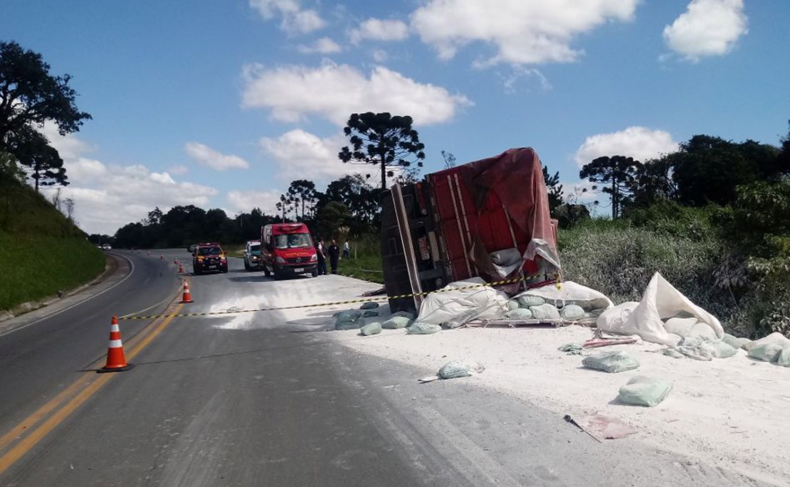 O caminhão transportava cal e a carga se espalhou pela pista. Por causa do tombamento, o Contorno Norte ficou com o trânsito completamente bloqueado no sentido a BR-277 e depois os policiais rodoviários estaduais começaram a controlar o fluxo de veículos no sistema “pare e siga”.