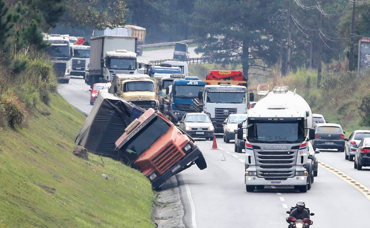 O tombamento de um caminhão no canteiro lateral do Contorno Norte, sentido Contorno Sul, em Curitiba, provoca congestionamento em um trecho com trânsito naturalmente intenso. O caminhão pode ter tombado no barrando por causa do desnível que existe no local, conforme mostram as imagens. O veículo parou encostado no barrando da via.