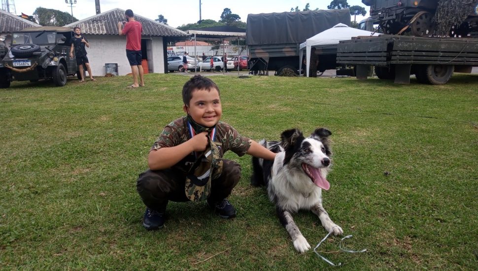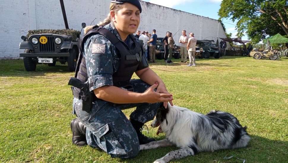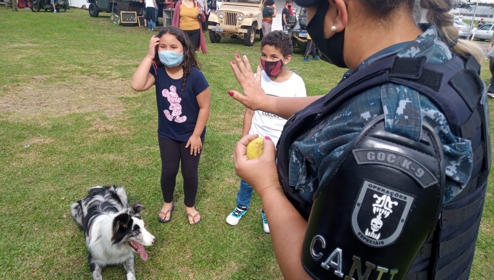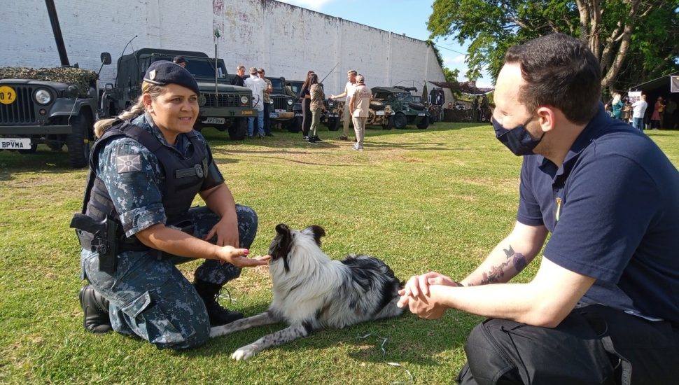 Mais uma vez a border collie Aysha, de 7 meses, cão integrado ao projeto “Cão Amigo” da Guarda Municipal de Curitiba, foi destaque em um evento de colecionadores de equipamentos militares realizado em Curitiba no sábado (22), em Santa Felicidade. O evento reuniu amantes da militaria e, entre outras atividades, contou com a exibição das peripécias que a Aysha sabe fazer. O cão é treinado pela guarda Simone de Fátima Lima, integrante do Grupo de Operações com Cães (GOC).