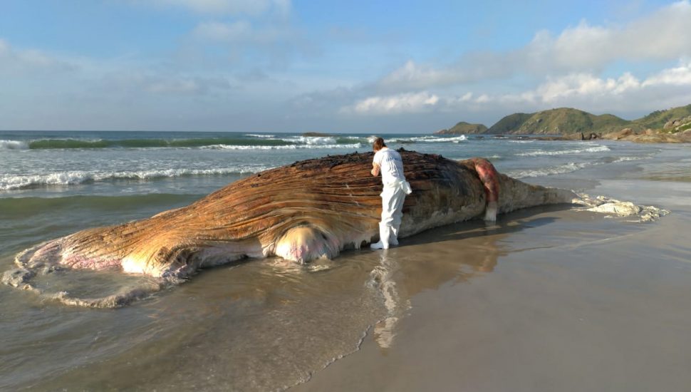 Uma baleia jubarte de quase 13 metros de comprimento foi encontrada morta na costa da Praia Grande da Ilha do Mel, Litoral do Paraná, na terça-feira (18). O animal, que estava morto no mar há alguns dias, foi encontrado na faixa de areia pela comunidade local.