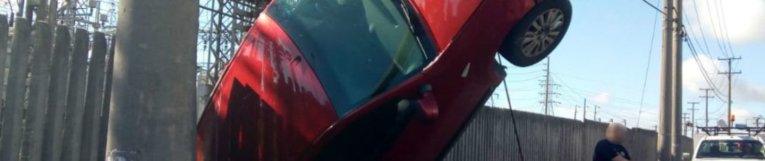 Carro é fisgado por fios de poste após bater contra muro em Curitiba
