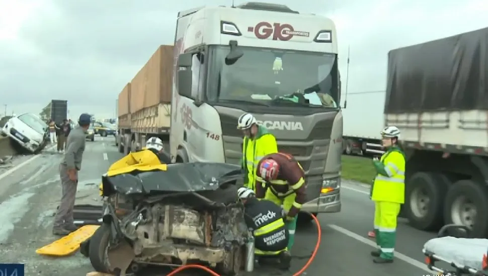 Um carro ficou prensado entre dois caminhões em um acidente registrado na manhã desta sexta-feira (03/10) no Contorno Leste de Curitiba. A colisão aconteceu no quilômetro 113 da BR-116, no sentido São José dos Pinhais.