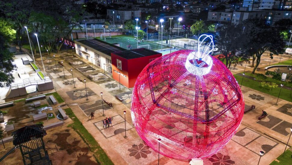 Uma árvore de Natal só é uma árvore de natal após ganhar seus enfeites. Por isso, a atração da Praça Afonso Botelho, no Água Verde, é uma bola de Natal gigante.