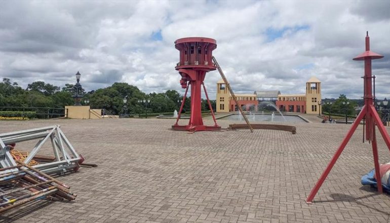 O carrossel veneziano começou a ser montado nesta sexta-feira (12) e vai ficar na esplanada onde estão dois cartões-postais do Tanguá: os espelhos d’água do Jardim Poty Lazzarotto e o belvedere. O brinquedo irá ocupar o lado oposto das duas atrações, próximo à escadaria que dá acesso ao local.