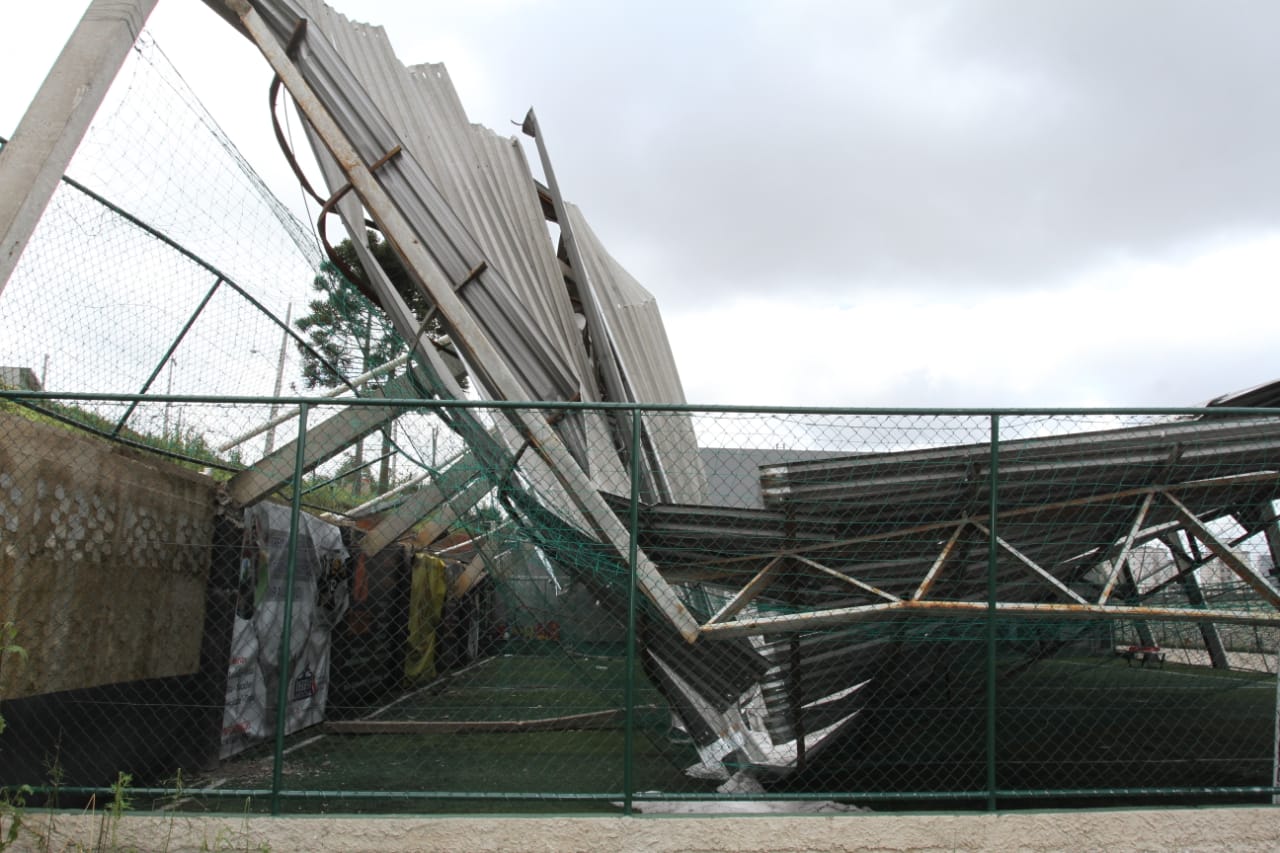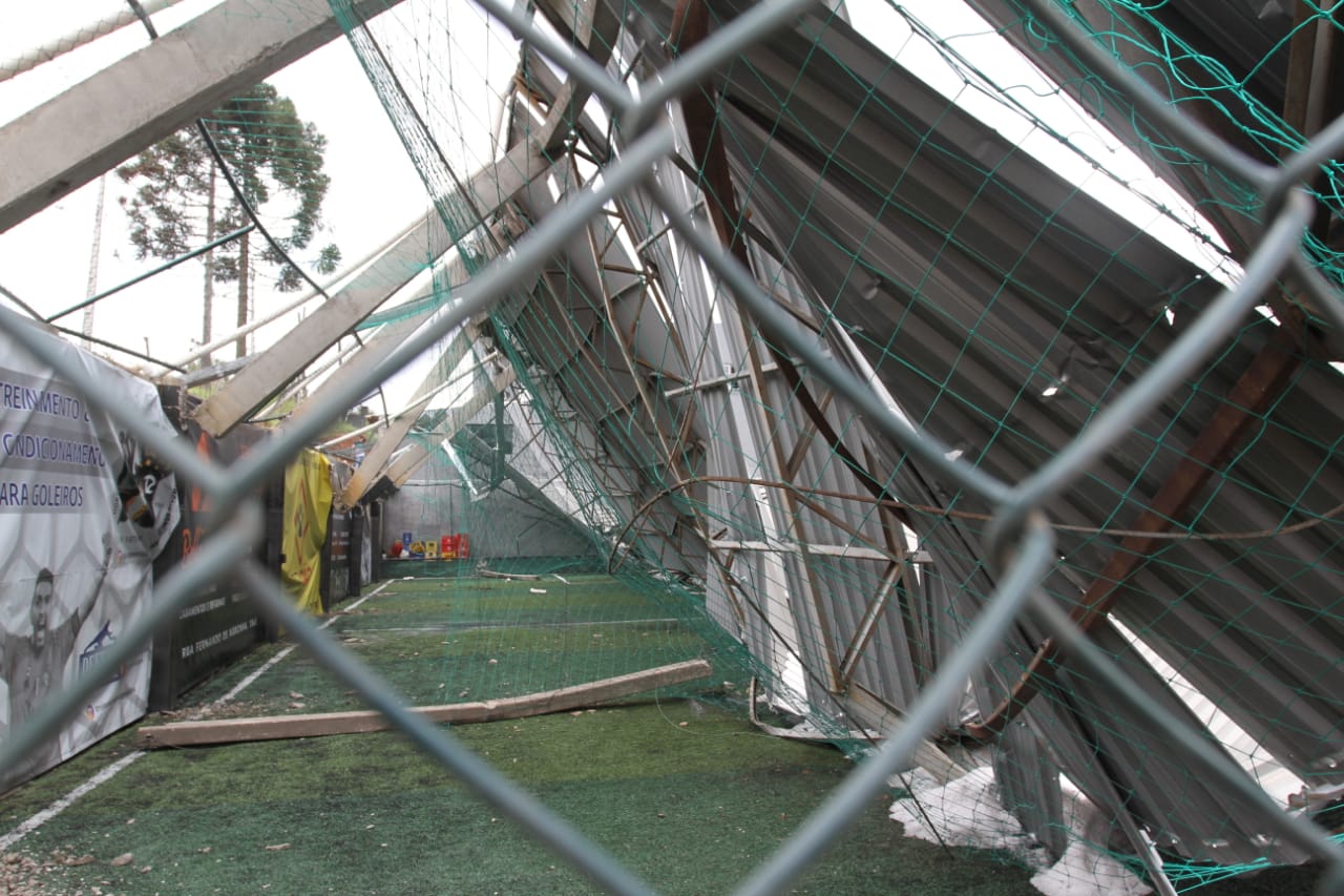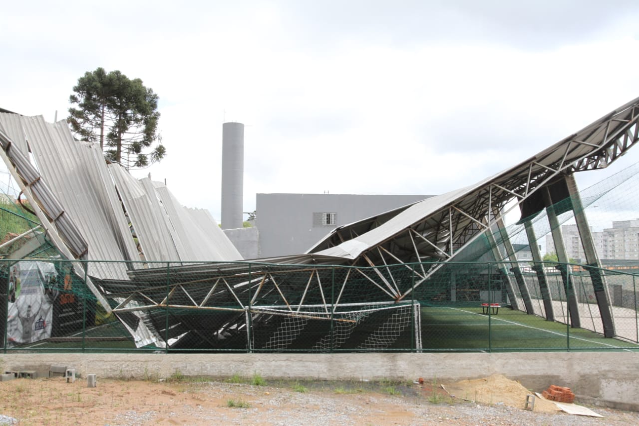 À margem da Linha Verde, no bairro Tingui, na capital, a estrutura de cobertura de uma quadra de futebol despencou, mostrando uma cena de completa destruição na manhã desta quarta. A estrutura construída recentemente não suportou o impacto da chuva e despencou. Na manhã desta quarta, ainda havia granizo no local.