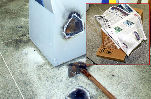 Cinco homens usando capuz para cobrir o rosto, armados com pistola e revólveres, e com rádios comunicadores, invadiram a agência do Detran, na Estrada da Ribeira, Jardim Guaraituba, em Colombo, na manhã de ontem. Usando maçarico, roubaram o dinheiro de um caixa eletrônico do Banco do Brasil. Dois seguranças foram rendidos, amarrados e tiveram a cabeça coberta com caixas de papelão para que não identificassem os suspeitos, que permaneceram no estabelecimento por cerca de uma hora. A quantia roubada não foi divulgada.