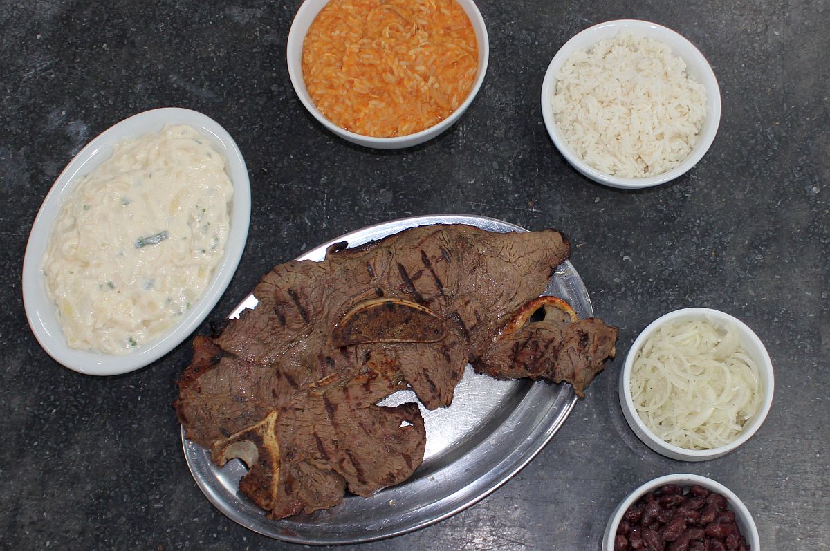 Churrasco Completo: R$147 – O churrasco completo é composto por carne, risoto, maionese, salada de cebola e feijão, e serve de duas a três pessoas.