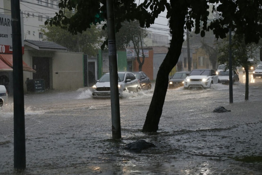 Queda de árvore e alagamento na esquina das Ruas Iapó e Comendador Roseira, próximo à PUC.