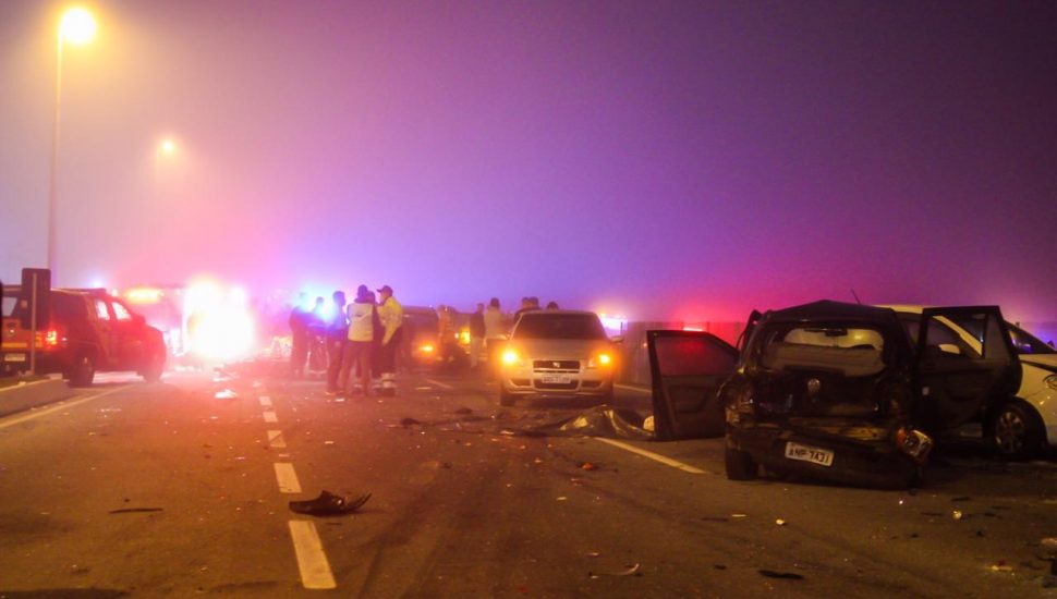 A densa fumaça de uma queimada na altura do km 77 da rodovia, perto do cruzamento com a Avenida Rui Barbosa, na região dos motéis, na divisa com Curitiba, foi o início do acidente. Entre os veículos envolvido estavam ao menos 16 carros, entre eles uma viatura da Polícia Militar (PM), cinco motos e um caminhão, além de pessoas atropeladas.