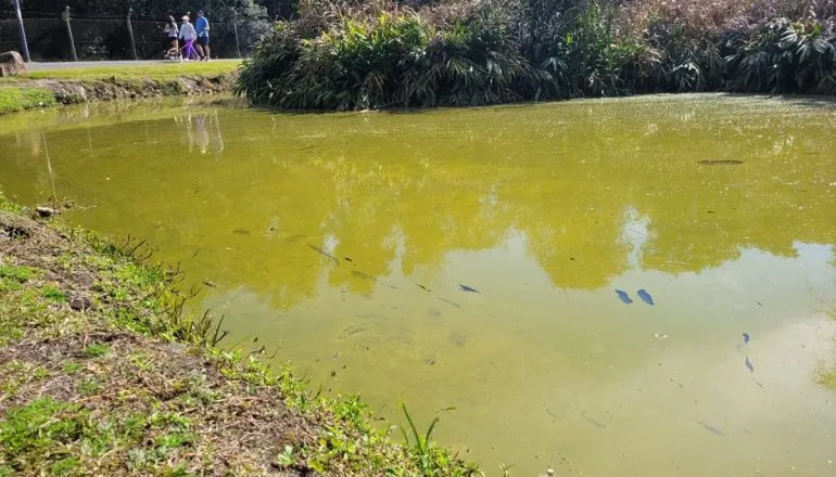 Com a combinação de luz solar, água parada e nutrientes disponíveis, ocorre a proliferação de algas e outros micro-organismos. Eles são os responsáveis pelo tom esverdeado da água, visível principalmente nos dias ensolarados.