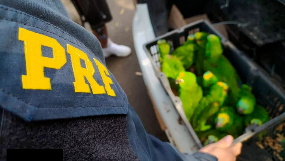 Por volta das 14 horas da tarde desta sexta-feira (22), policiais rodoviários federais abordaram dois homens, de 20 e 38 anos, que ocupavam um veículo modelo Voyage, na BR-373, em Ponta Grossa, nos Campos Gerais. Durante a vistoria, encontraram no interior do carro e no porta-malas 105 papagaios-verdadeiros e outros 10 pássaros que, até o fechamento desta matéria, não haviam sido identificados. Um dos ocupantes do carro era procurado pela justiça por porte ilegal de arma de fogo.