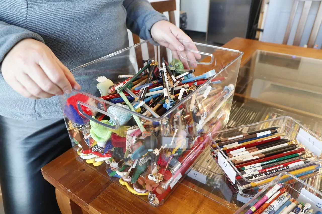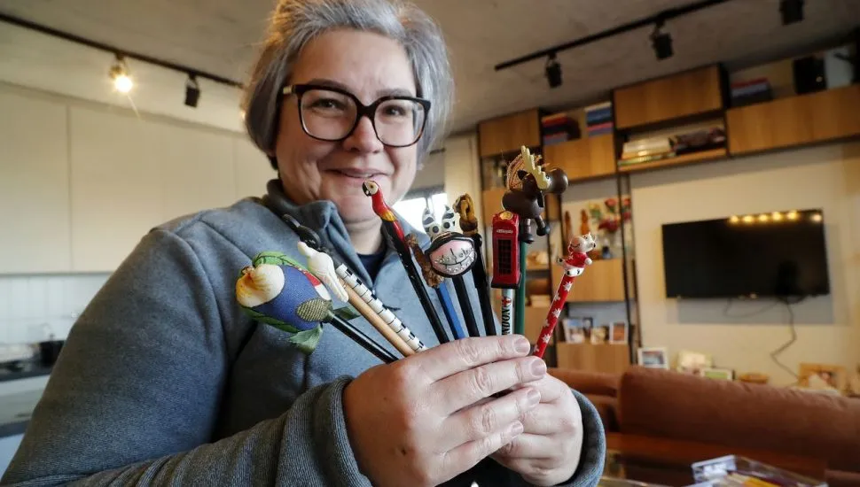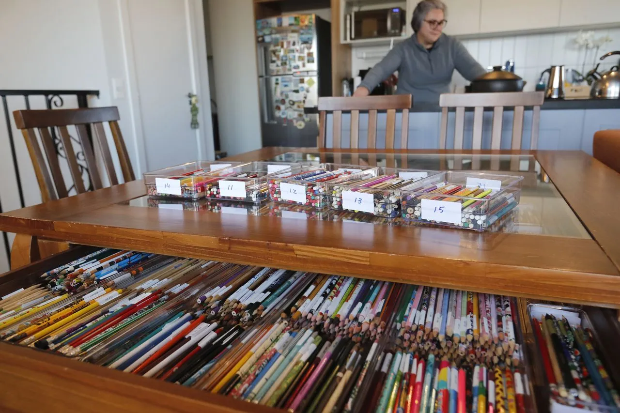 “A cada viagem eu trazia 50 lápis. Uma vez eu parei no raio-x [do aeroporto], [os lápis] estavam todos enrolados, passei e tive que explicar o que eram. Eu tava em conexão na Alemanha. Eu pensei ‘meu Deus, agora eu vou ser presa por causa dos lápis’. Tem cada história”, ri a colecionadora.