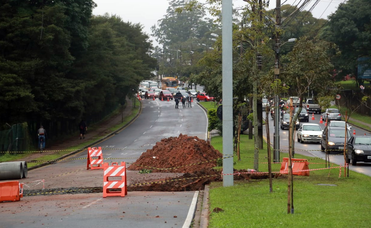 Os reparos após o rompimento de uma galeria pluvial na Avenida Lothário Meissner na pista em direção ao Cristo Rei, ao lado do Jardim Botânico, em Curitiba, geraram ao menos nove quilômetros de congestionamento entre na BR-277 na manhã desta segunda-feira (3). Por volta das 9h30, o fluxo era intenso por pelo menos três quilômetros.