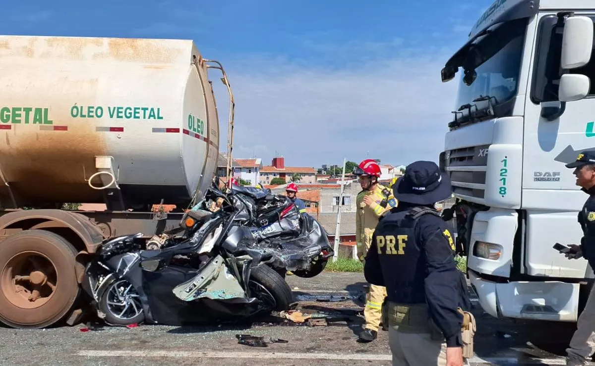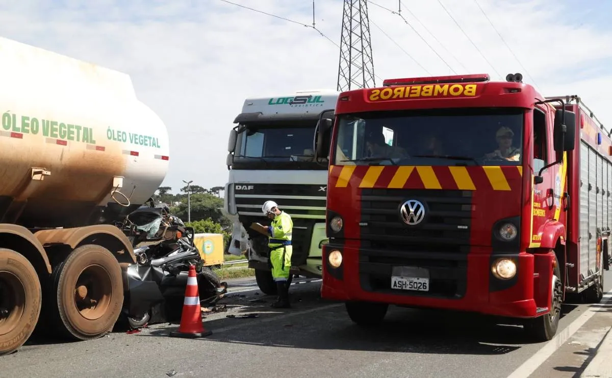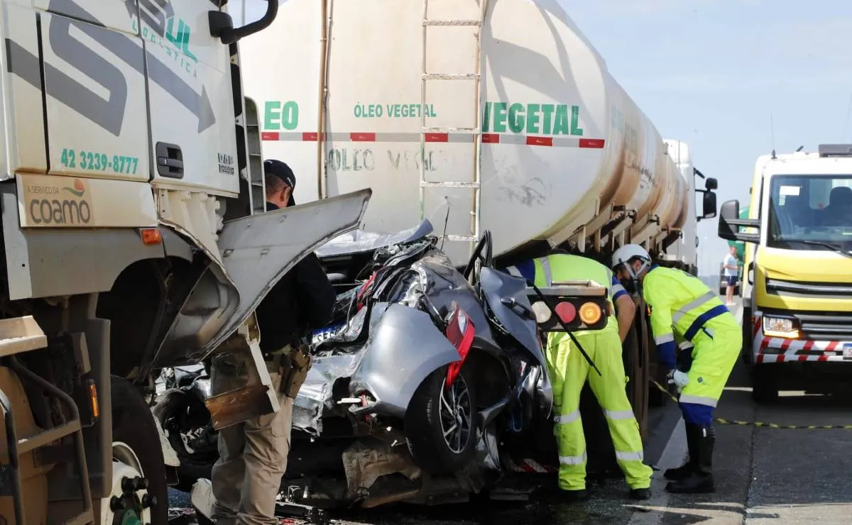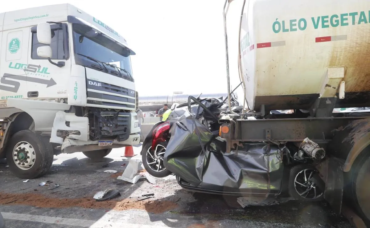 Um engavetamento no Contorno Sul, próximo ao Viaduto do Caiuá, resultou na morte de um motorista de um Toyota Yaris cinza. O trânsito estava parado no sentido São José dos Pinhais, na Região Metropolitana de Curitiba, quando um caminhão bateu na traseira do carro e o esmagou ao colidir com outro veículo pesado.
