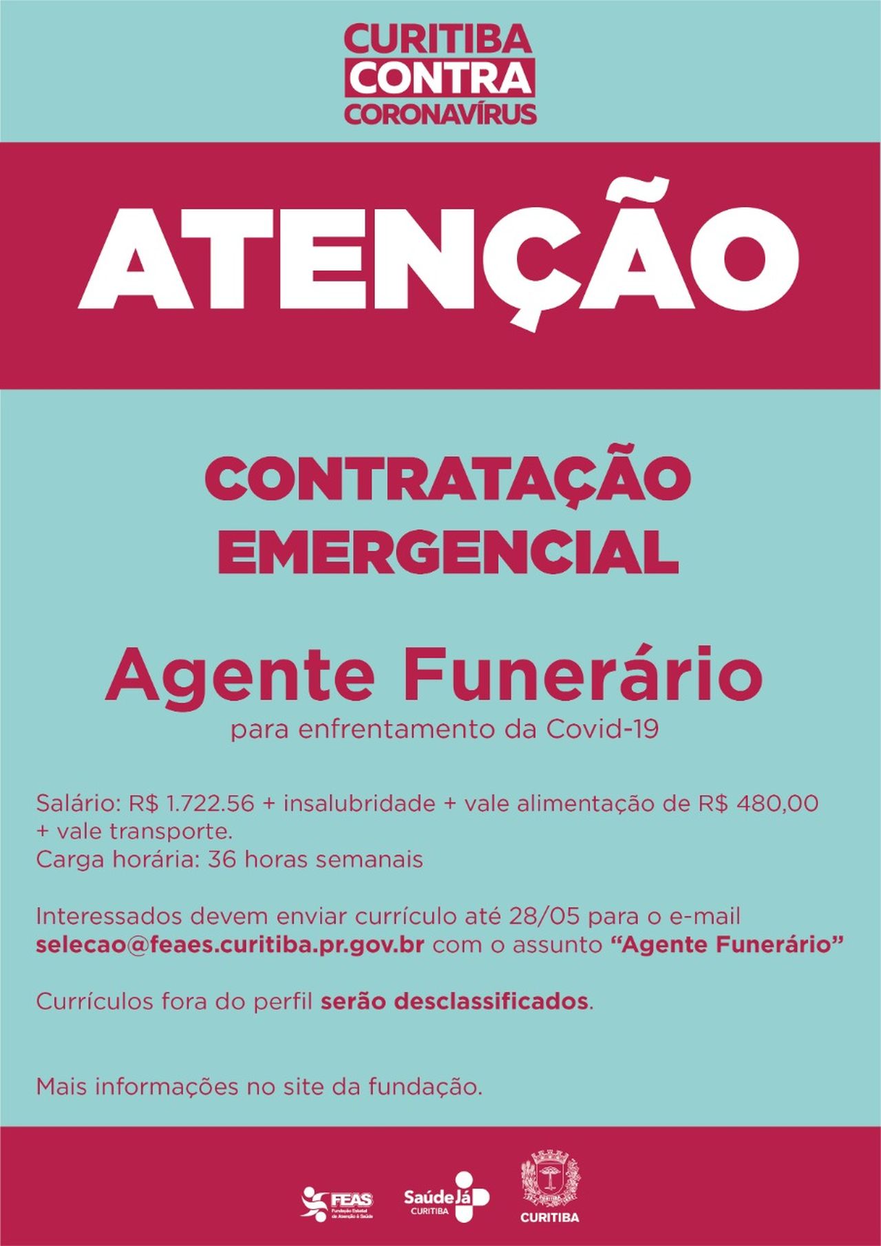 Os editais com as vagas estão publicados no site da Fundação Estatal de Atenção à Saúde de Curitiba (Feaes), instituição de administração indireta da prefeitura. Também é verdade que o caráter de emergência dessas vagas é por causa da pandemia.