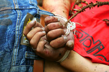 As mãos e pés amarrados, venda e mordaça, hematomas e cortes feitos à faca pelo corpo denunciavam a tortura pela qual um rapaz, de pouco mais de 20 anos, passou antes de ser morto.